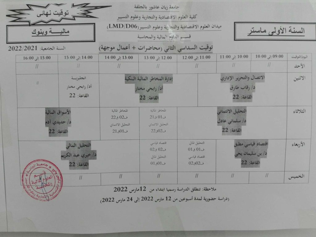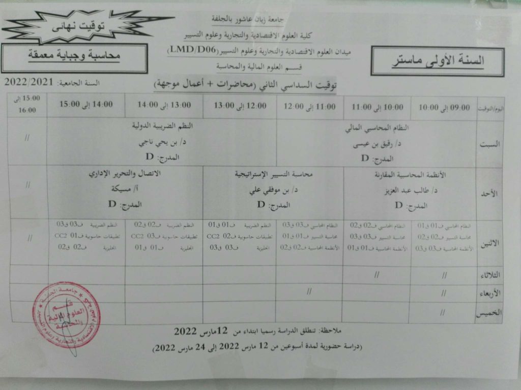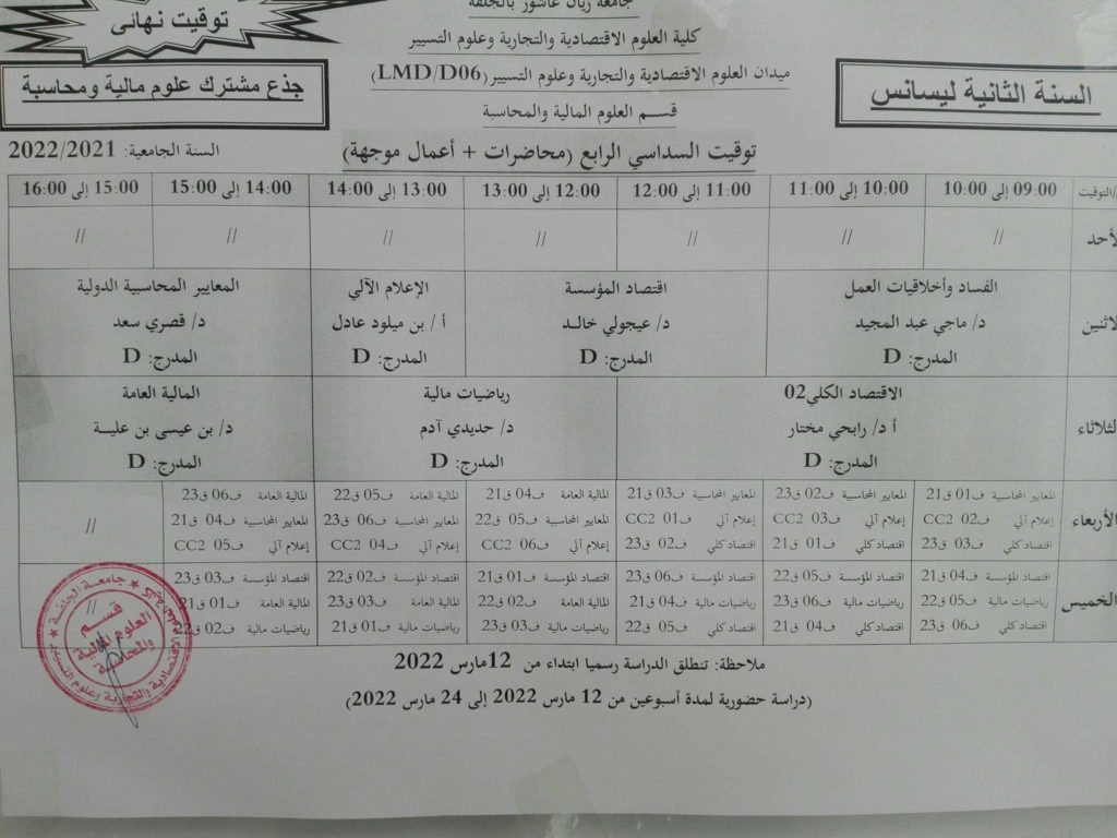 توقيت السداسي الثاني قسم العلوم المالية والمحاسبة للسنة الجامعية 2022/2021