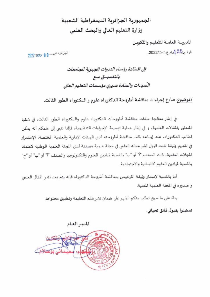 إجراءات مناقشة أطروحة الدكتوراه علوم والدكتوراه الطور الثالث