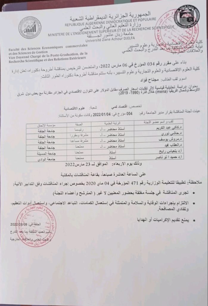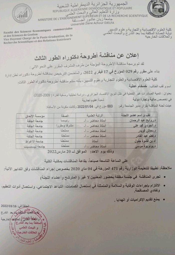 إعلان عن مناقشة أطروحة الدكتوراه الطور الثالث