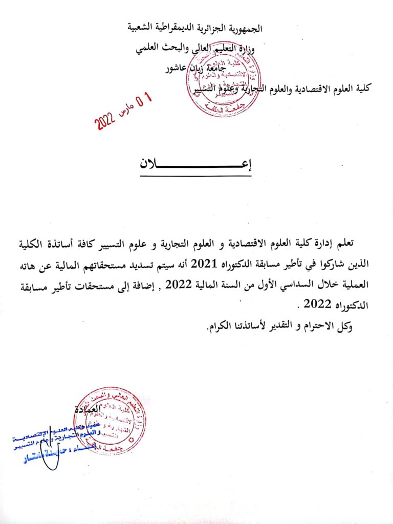 إعلان للأساتذة المشاركين في تأطير مسابقة الدكتوراه 2021