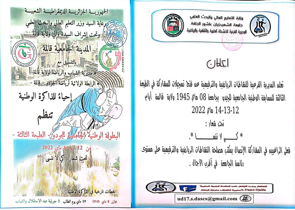 إعلان المديرية الفرعية للنشاطات الرياضية والترفيهية عن فتح تسجيلات للمشاركة في الطبعة الثالثة للمسابقة الوطنية الجامعية للجيدو بجامعة 08 ماي 1945 ولاية قالمة