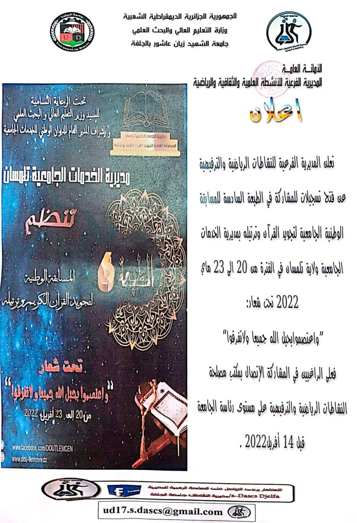 إعلان المديرية الفرعية للنشاطات الرياضية والترفيهية عن فتح تسجيلات للمشاركة في الطبعة السادسة للمسابقة الوطنية الجامعية لتجويد القرآن الكريم وترتيله بمديرية الخدمات الجامعية ولاية تلمسان