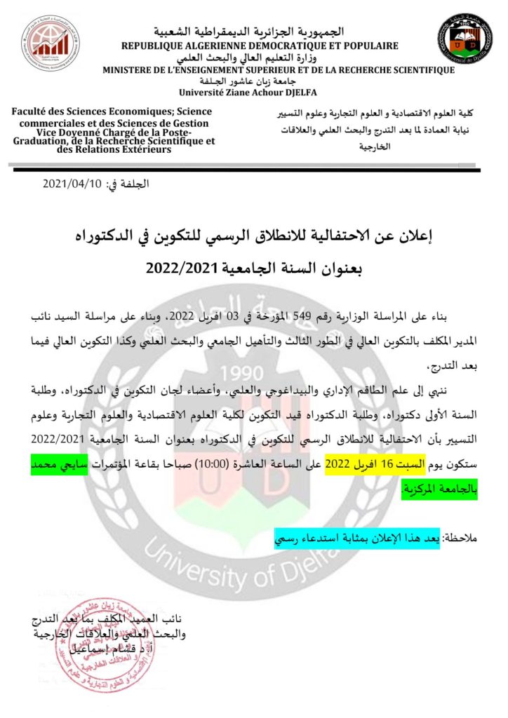 إعلان عن الاحتفالية للانطلاق الرسمي للتكوين في الدكتوراه بعنوان السنة الجامعية 2021/2022