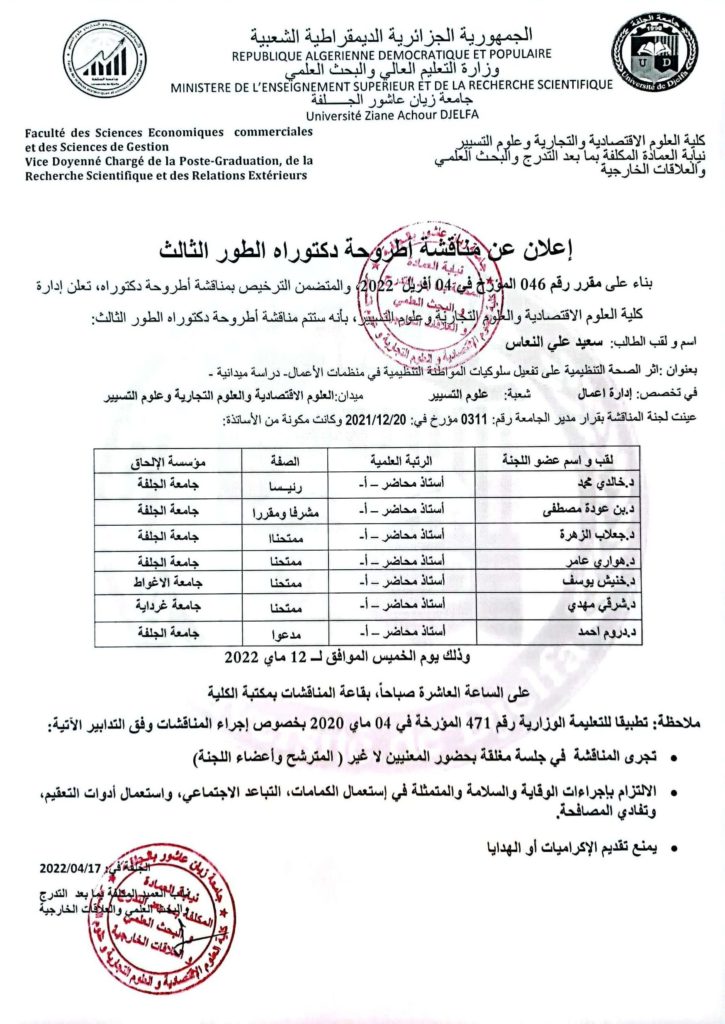 إعلان عن مناقشة أطروحة دكتوراه الطور الثالث