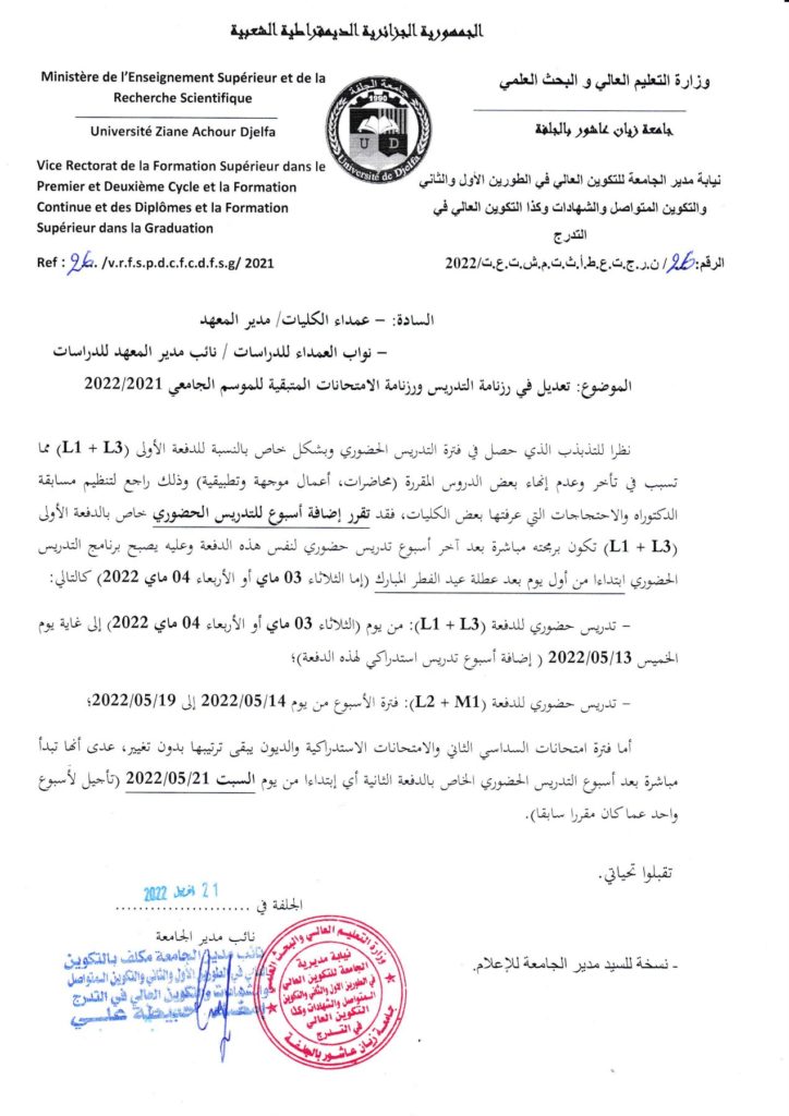 تعديل في رزنامة التدريس ورزنامة الامتحانات المتبقية للموسم الجامعي 2021/2022