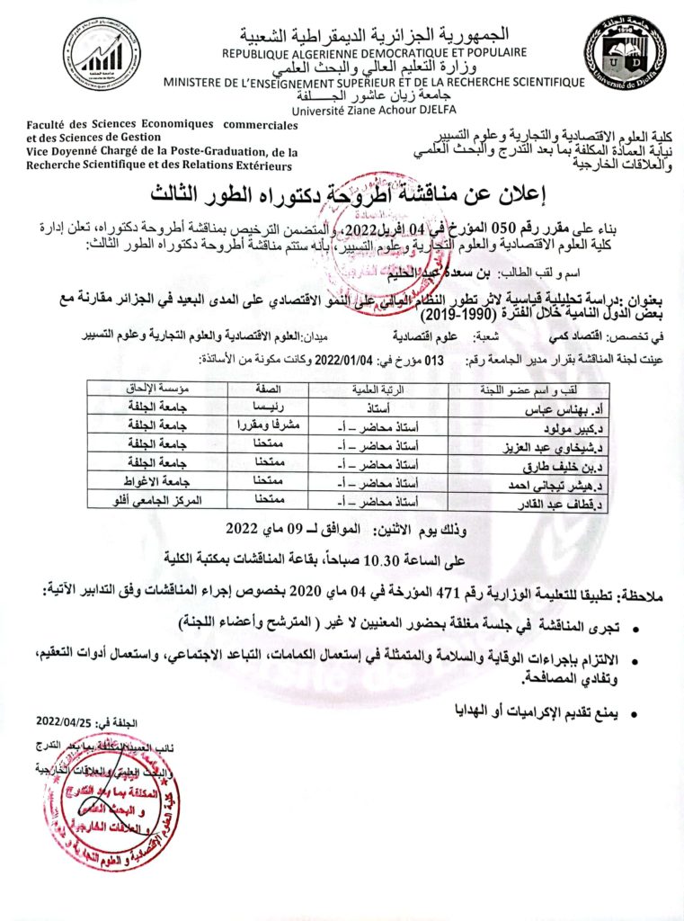 إعلان عن مناقشة أطروحة دكتوراه الطور الثالث
