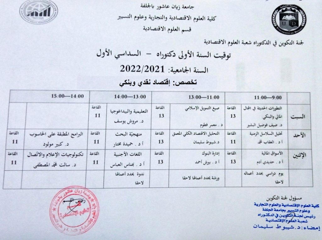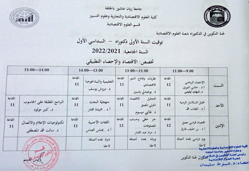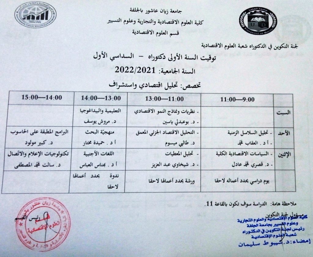 توقيت السداسي الأول للسنة أولى دكتوراه تخصص علوم إقتصادية للسنة الجامعية 2022/2021