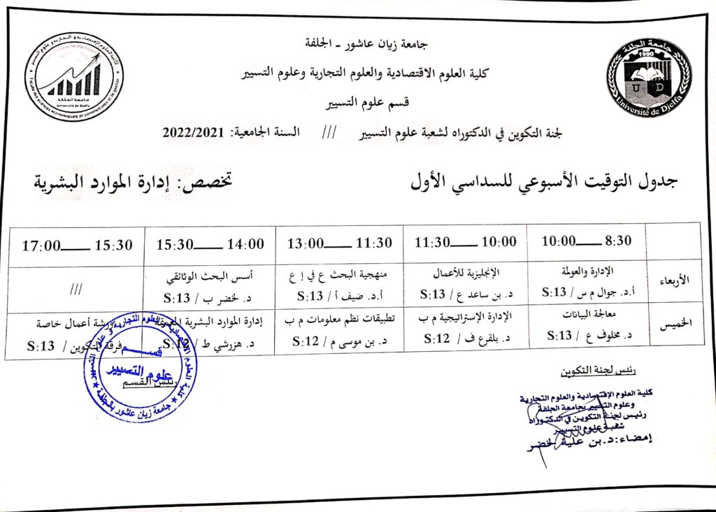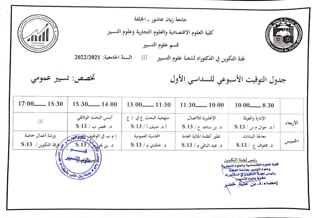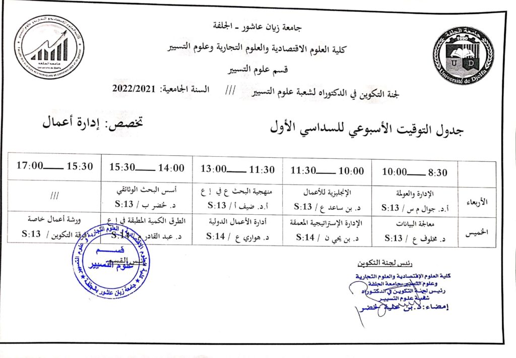 توقيت السداسي الأول للسنة أولى دكتوراه تخصص علوم التسيير للسنة الجامعية 2022/2021
