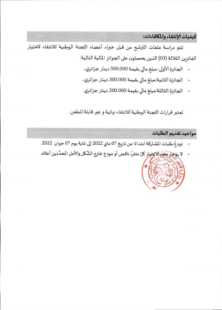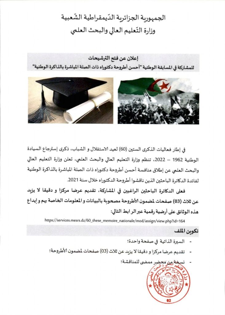 فتح الترشيحات للمشاركة في المسابقة الوطنية “أحسن أطروحة دكتوراه ذات الصلة المباشرة بالذاكرة الوطنية”