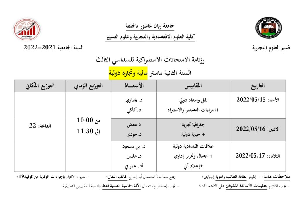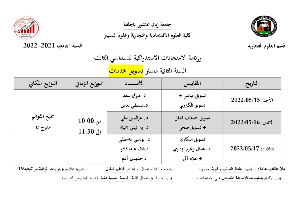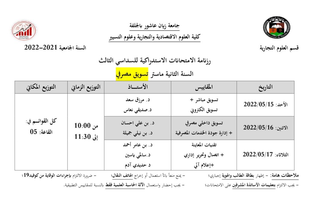 رزنامة الامتحانات الإستدراكية للسداسي الثالث السنة الثانية ماستر قسم العلوم التجارية