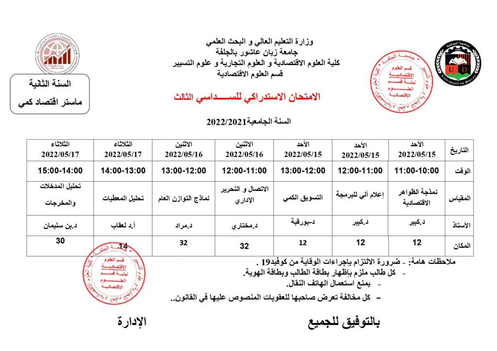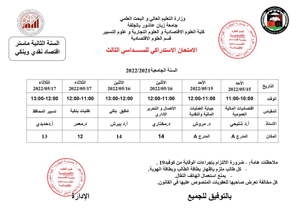 رزنامة الامتحانات الإستدراكية للسداسي الثالث السنة الثانية ماستر قسم العلوم الإقتصادية