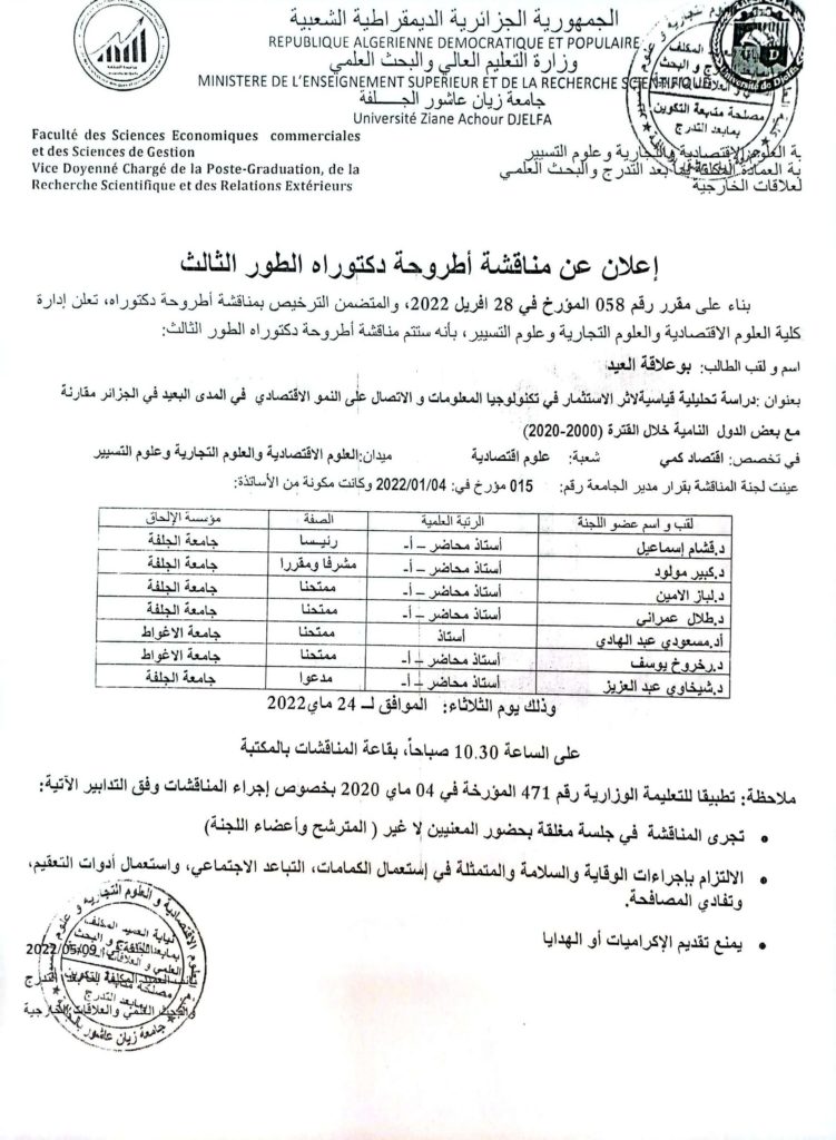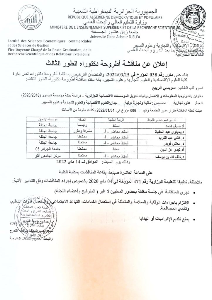 إعلان عن مناقشة أطروحة دكتوراه الطور الثالث
