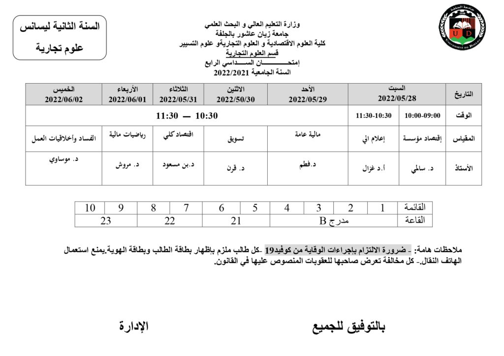 رزنامة امتحانات السداسي الثاني قسم العلوم التجارية للسنة الجامعية 2022/2022