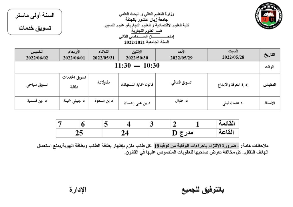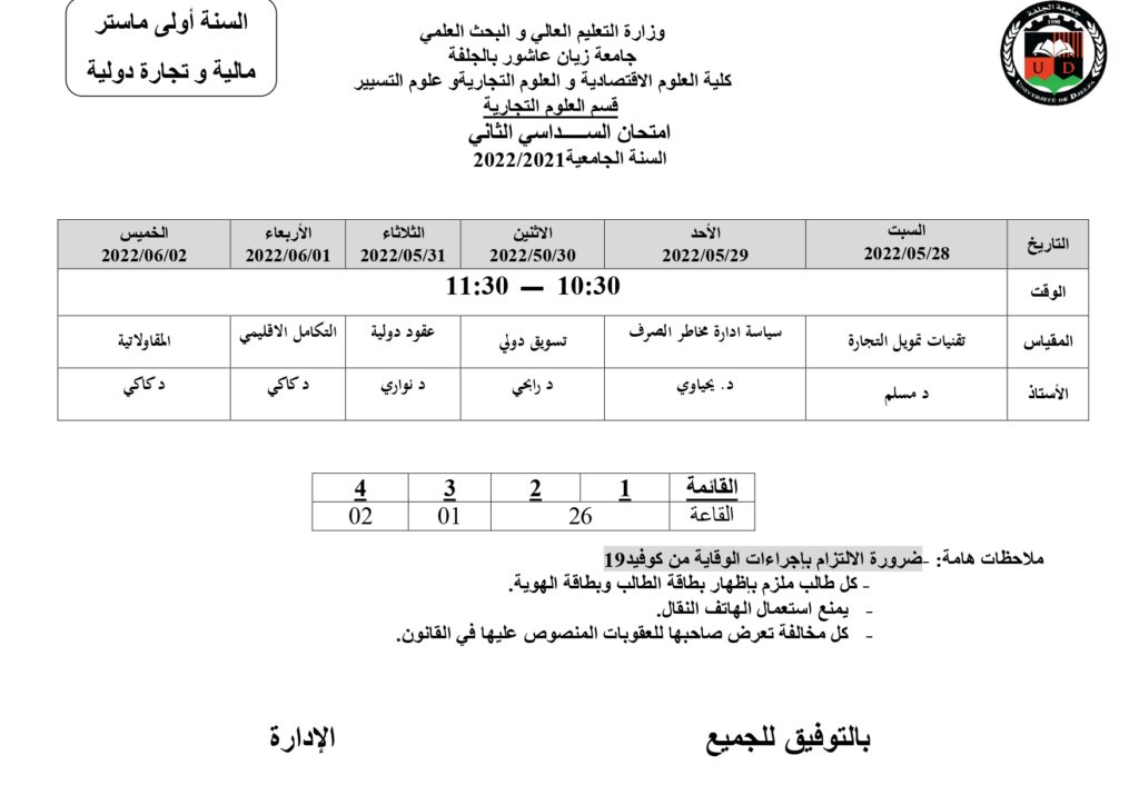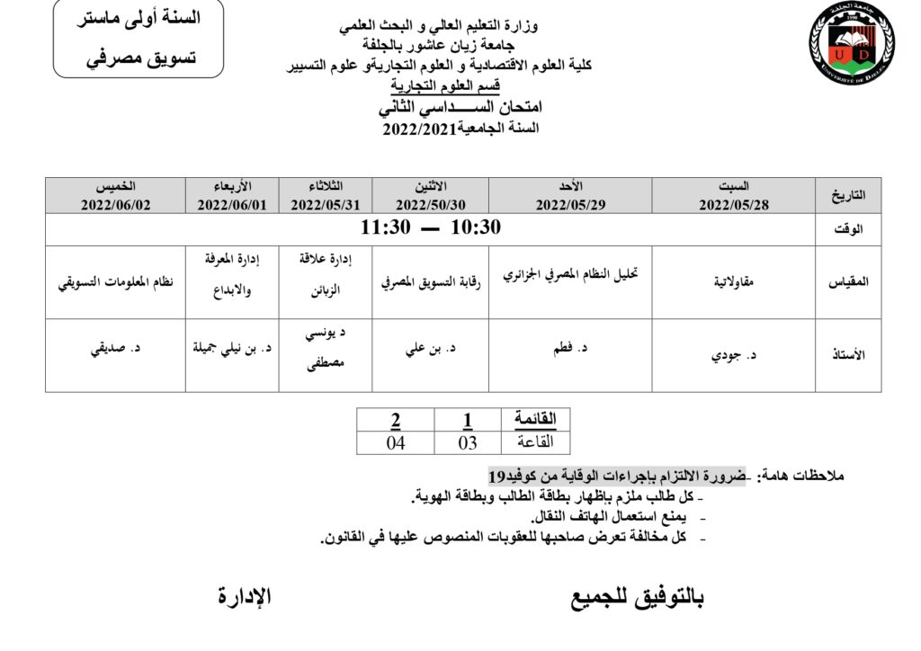 • Next story رزنامة امتحانات السداسي الثاني قسم علوم التسيير للسنة الجامعية 2022/2022