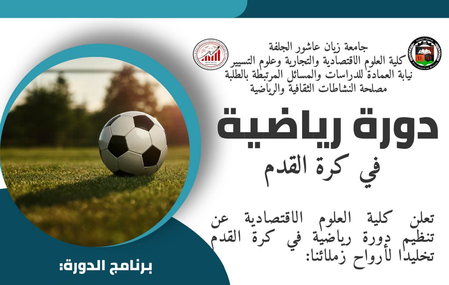 - إيام دكتورالية تحت عنوان : كيف تنشر مقال في مجلة مصنفة A+،A (النشر الدولي من الالف إلى الياء) يومي 25-26 فيفري بقاعة المحاضرات قراش عفاف بكلية الاقتصاد ( الدعوة عامة)